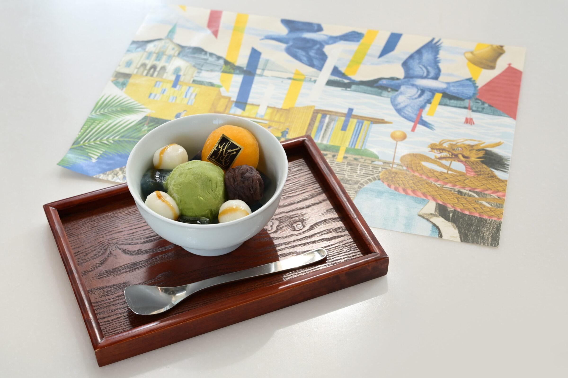2日間限定であんみつが登場。カフェご利用の方には、ランチョンマットとして使える河井いづみデザインのアートペーパーをプレゼントします。