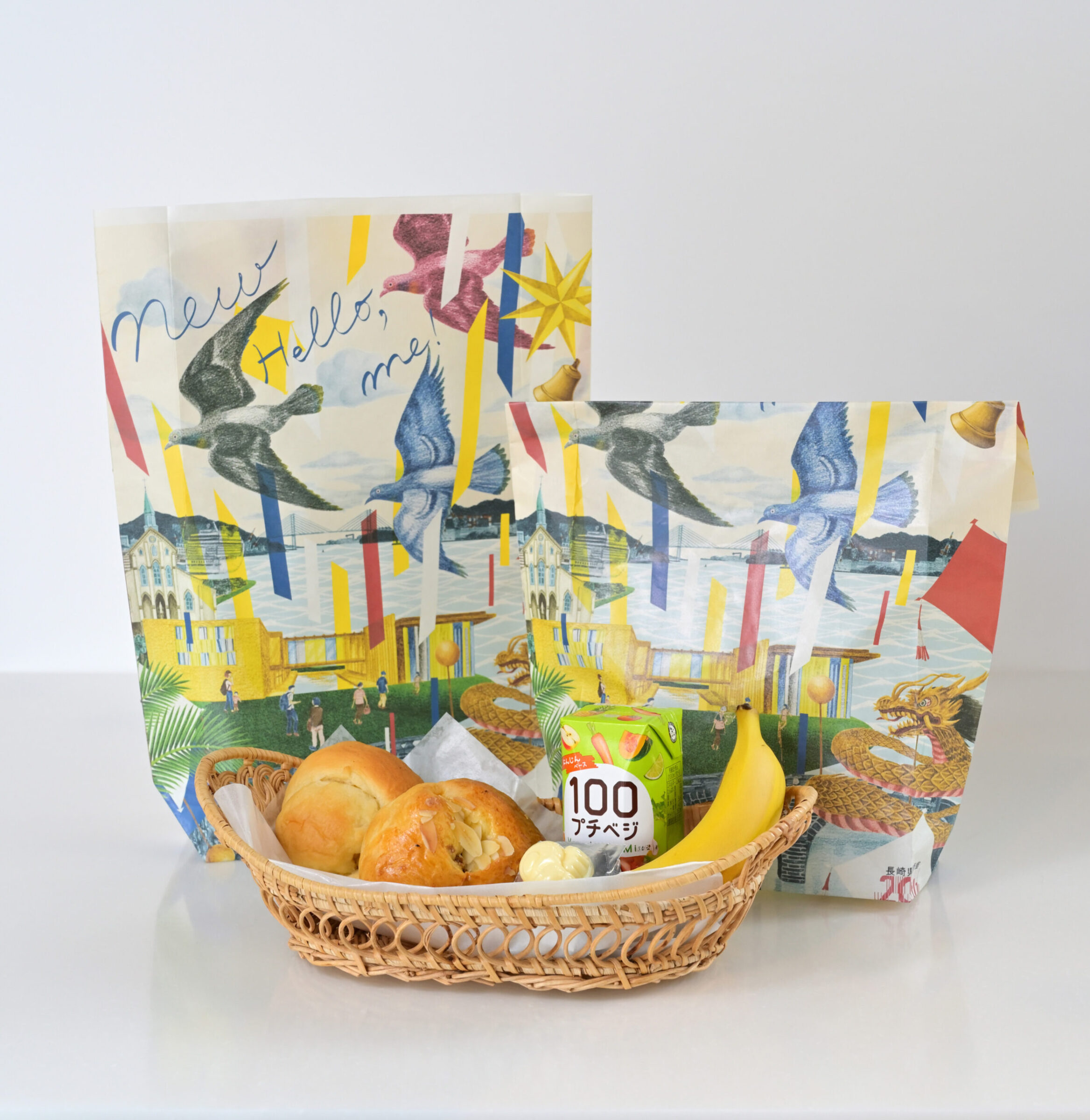 朝活の後のご褒美にモーニングセットをご用意しました。河井いづみデザインのアートペーパーを使った紙ぶくろに、フカダベーカリーのパンやドリンクなどを詰めました。